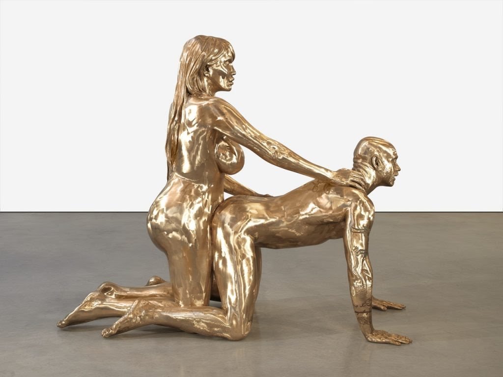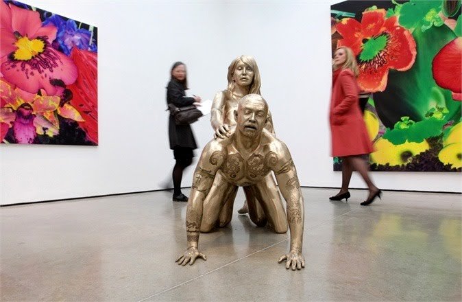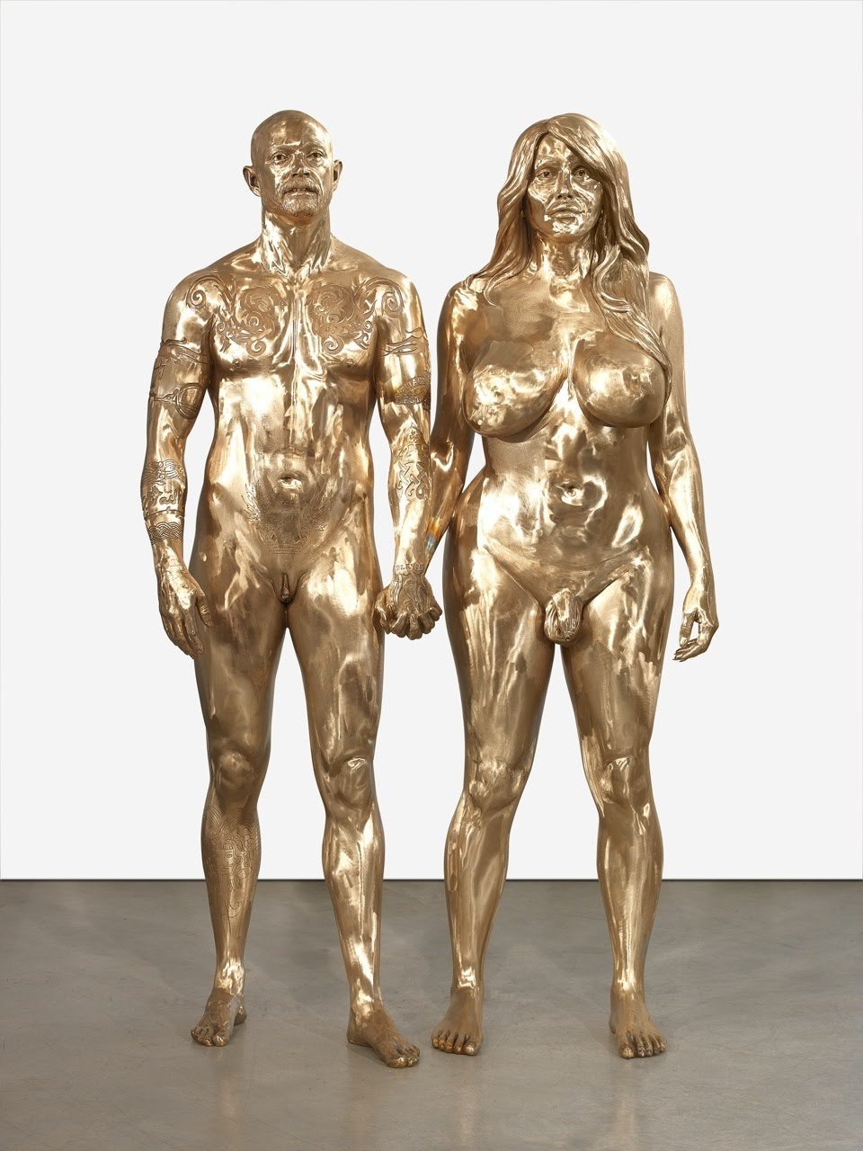 Imagen: Una niña posando junto a la obra del artista contemporáneo, Marc Quinn, de dos transexuales en los papeles de «Adán y Eva».