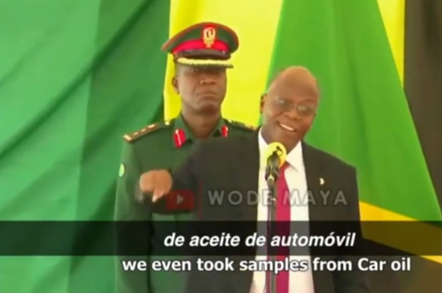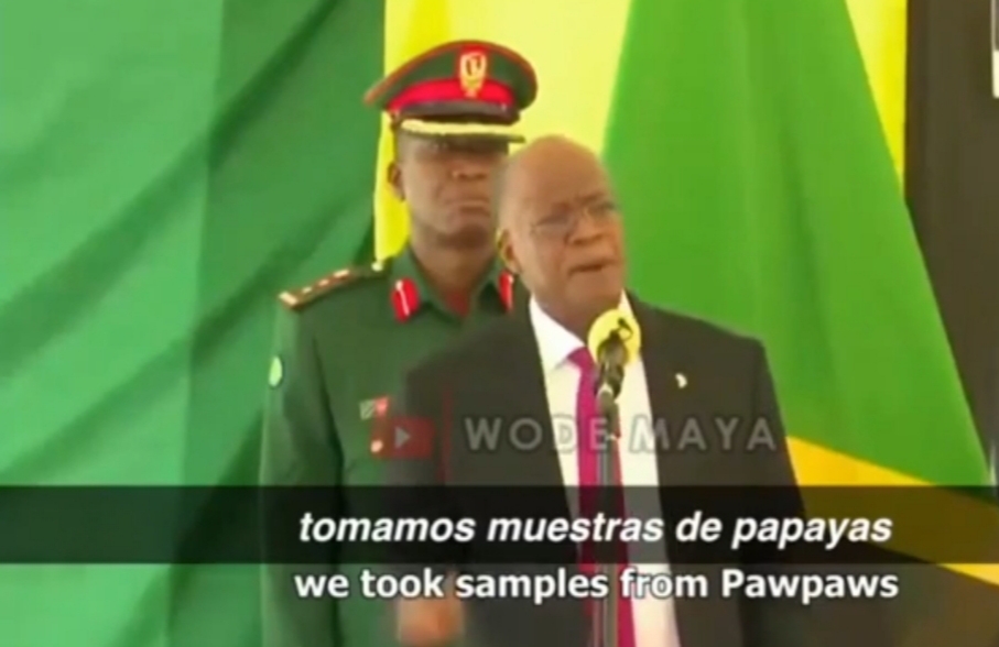 “Cuando tomamos las muestras de una papaya, lo llamamos Elizabeth Ane 26 años, mujer, y los resultados dan positivo de corovirus, lo que significa que el líquido de la papaya es positivo. Tomamos muestras de un tipo de pájaro llamado kware (codorniz), los resultados dan también positivos, tomamos muestras de un conejo, el resultado regresa indeterminado. Tomamos muestras de una cabra y los resultados fueron positivos y así sucesivamente», expresó el mandatario de dicho país.